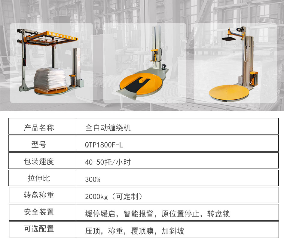 大宏佳(jiā)森全自動遙控(kòng)纏繞機QTP1800F-L采用全自動上斷膜裝置,搭配遙控裝置,操作員無需下叉車,
