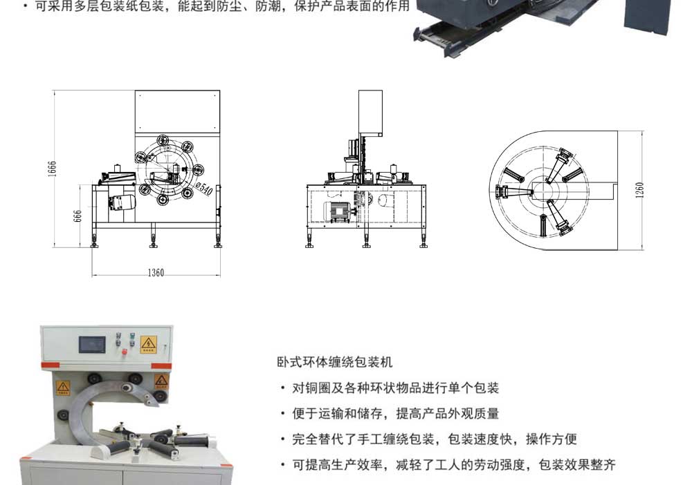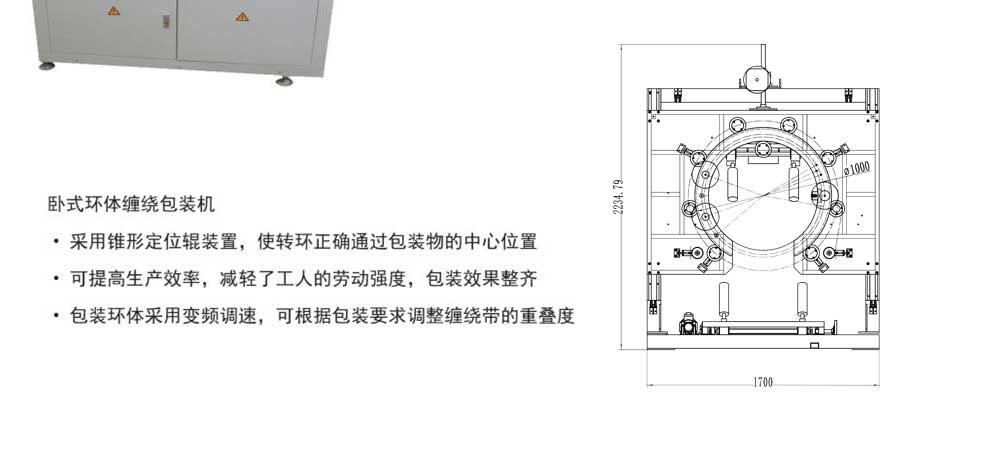 環體纏繞包裝機是專門為鋼圈(quān)、鋼絲、銅絲、輪胎、帶鋼等金屬環狀物品而設計、製造的(de)一種(zhǒng)新穎的纏繞包裝機,其優點在於(yú)完全替代了手工纏繞包(bāo)裝,包裝速度快,操作方便,大大提高了生產效率,減(jiǎn)輕了(le)工人的勞動強度。包裝效果整齊。可采用多(duō)層包裝紙包裝,能起到防塵,防潮,保護設備表麵的作用。