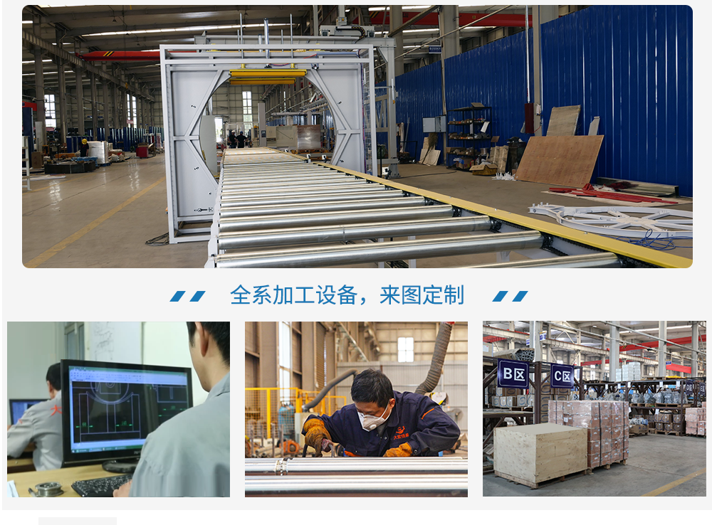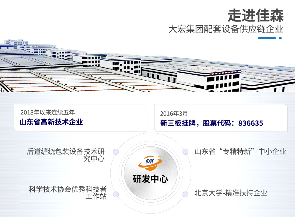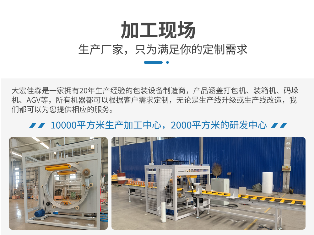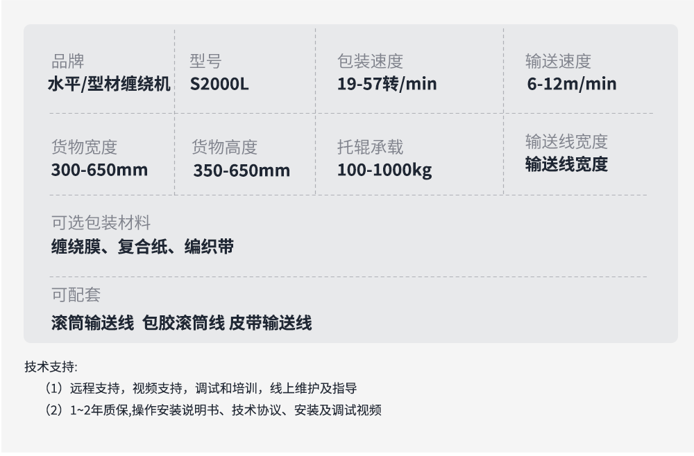 大(dà)宏佳(jiā)森水平纏繞機S2000L適用於建材、型材、管材(cái)等行業,配合(hé)自動輸送(sòng)設備,實(shí)現產品的高速(sù)全自動無人操作的薄膜纏繞包(bāo)裝,可有效保(bǎo)持貨物穩定,方便(biàn)運輸及儲存,減少貨物在(zài)運送途中破損,以纏繞膜、無紡布、複合紙等為主(zhǔ)要包裝材料,對長形棒材、管材、板材、線(xiàn)材等(děng)進行(háng)纏繞包裝。采用 PLC 可編程控製(zhì)器控製(zhì)。采用人機對(duì)話觸摸屏(píng)。可依包裝要求調整纏繞重疊度。光電感測(cè),自動連(lián)續工作,膜架自動複位。安全(quán)、穩定、高效、便捷。
