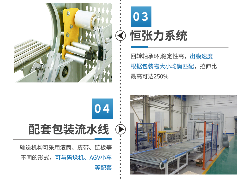 通過圓形鋁環(huán)帶動纏繞膜圍繞貨物轉動實現貨物包裝
