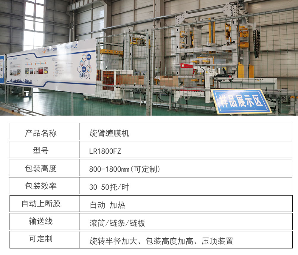 大宏(hóng)佳森在線式旋臂(bì)纏繞機LR1800FZ懸臂纏繞機(jī)主要適用於(yú)生產量大、包裝效率較高的現代化作(zuò)業,包裝成本低效率高滿(mǎn)足貨物的包裝要求(qiú)。可根據不同的產品和現(xiàn)場的實際需求,定製不同的包裝係統,自動完(wán)成貨物的感(gǎn)測、包裝,輸送等全過程,輸送(sòng)係統可采用滾筒、鏈(liàn)條、鏈板等不(bú)同的形式,自(zì)動上斷膜機構(gòu)可實(shí)現無人化(huà)操作。廣泛應用於食(shí)品、飲(yǐn)料、化工、造紙、建材等(děng)行業。